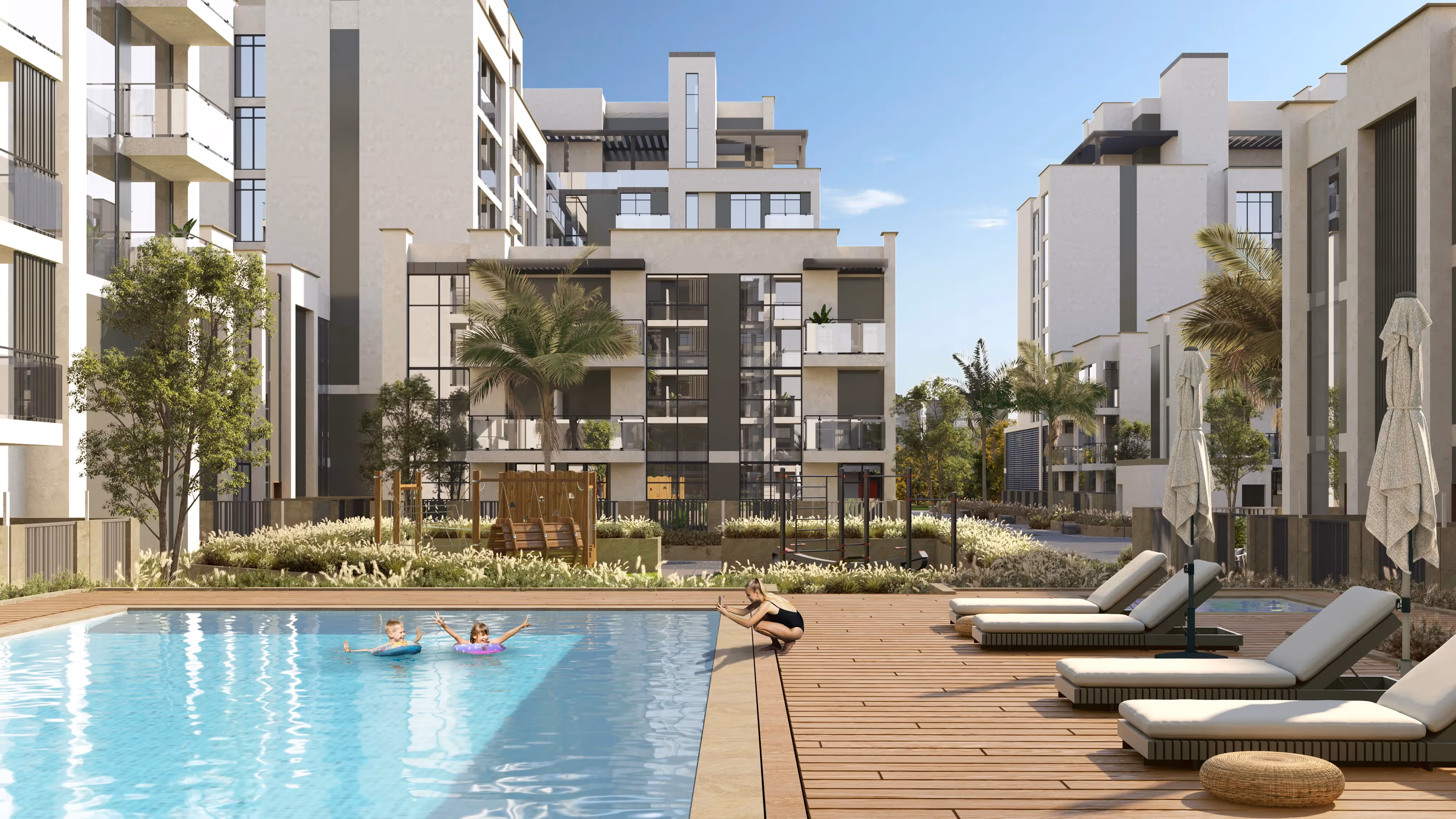 The architecture of the complex is designed in a contemporary style, featuring clean lines, large panoramic windows, and light façades that create a sense of openness and airiness.